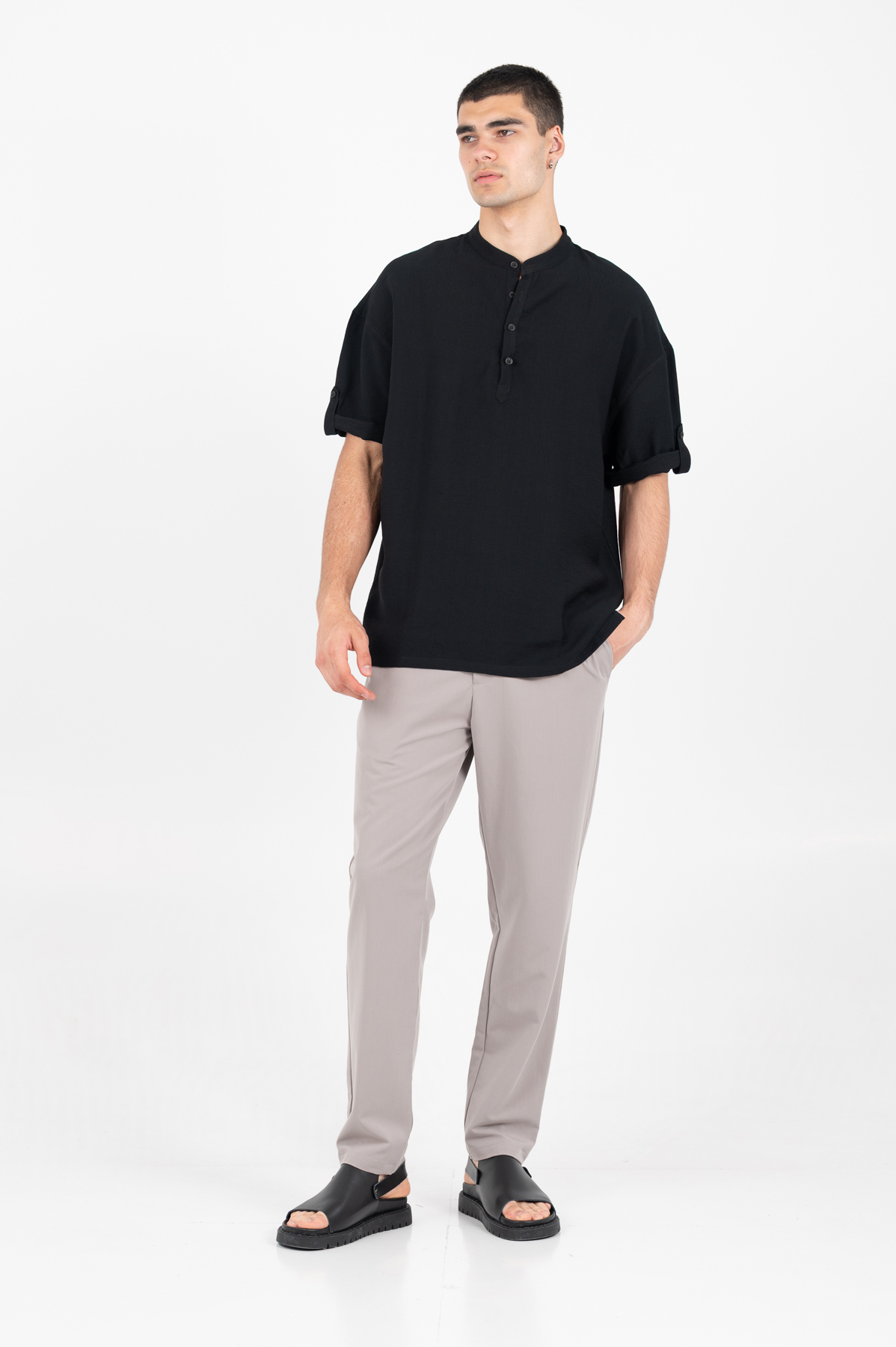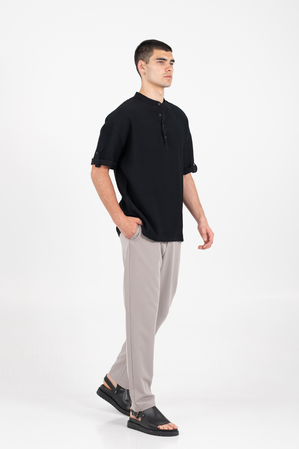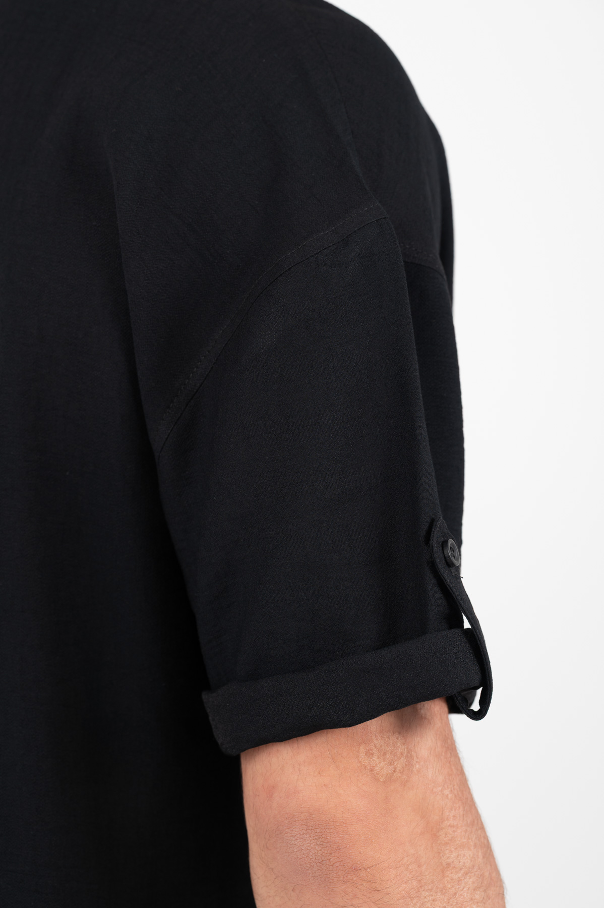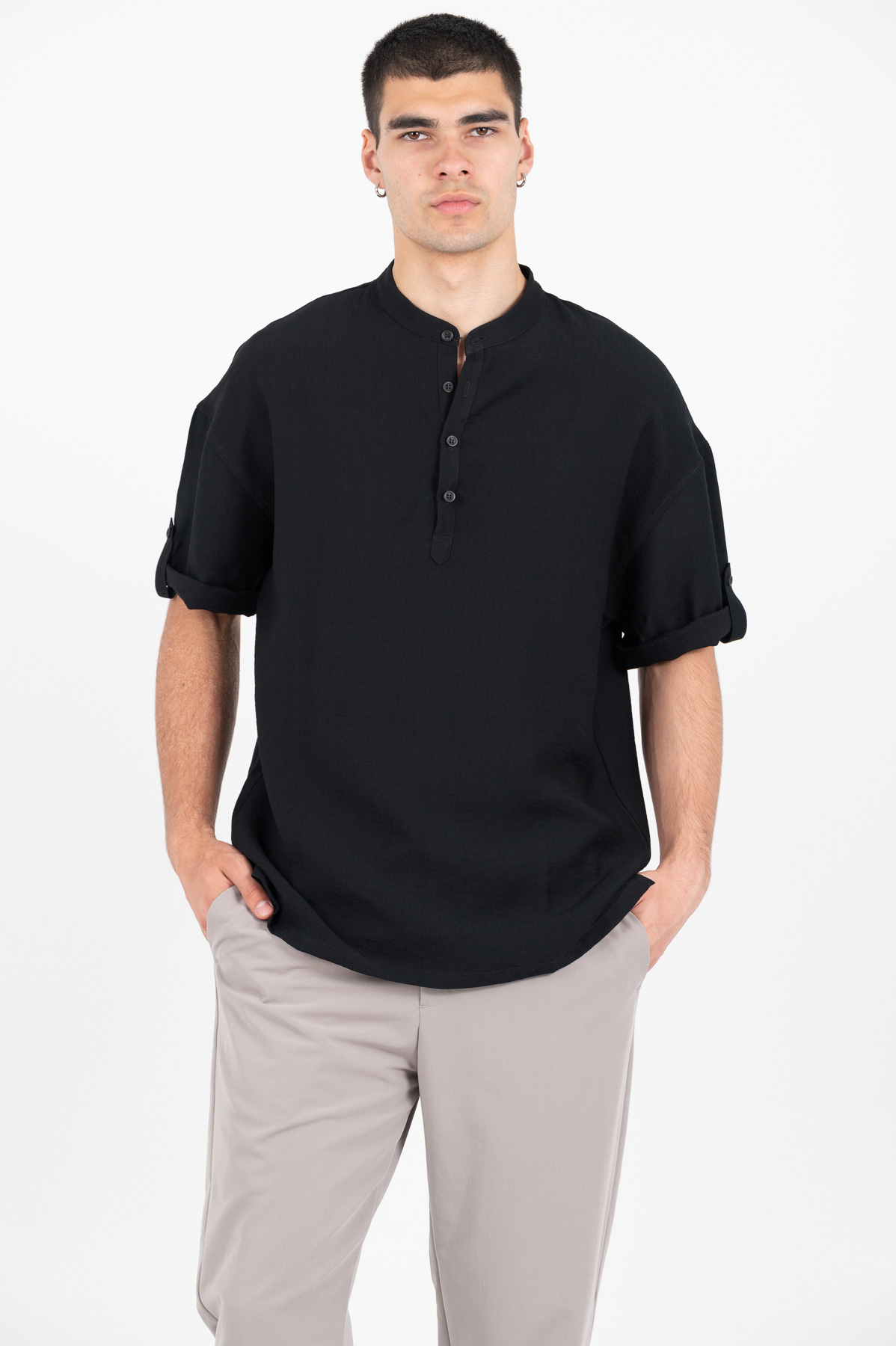 -Πουκαμίσα μάο με κουμπία μέχρι το στήθος , ρεβερ στο μανίκι και κλείσιμο με κουμπί