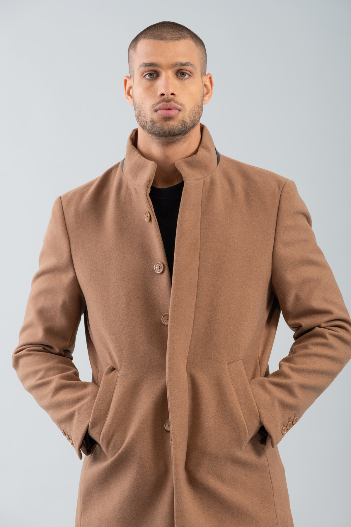-Ίσιο παλτό με μάο γιακά και μαύρη λεπτομέρεια σε αυτόν.