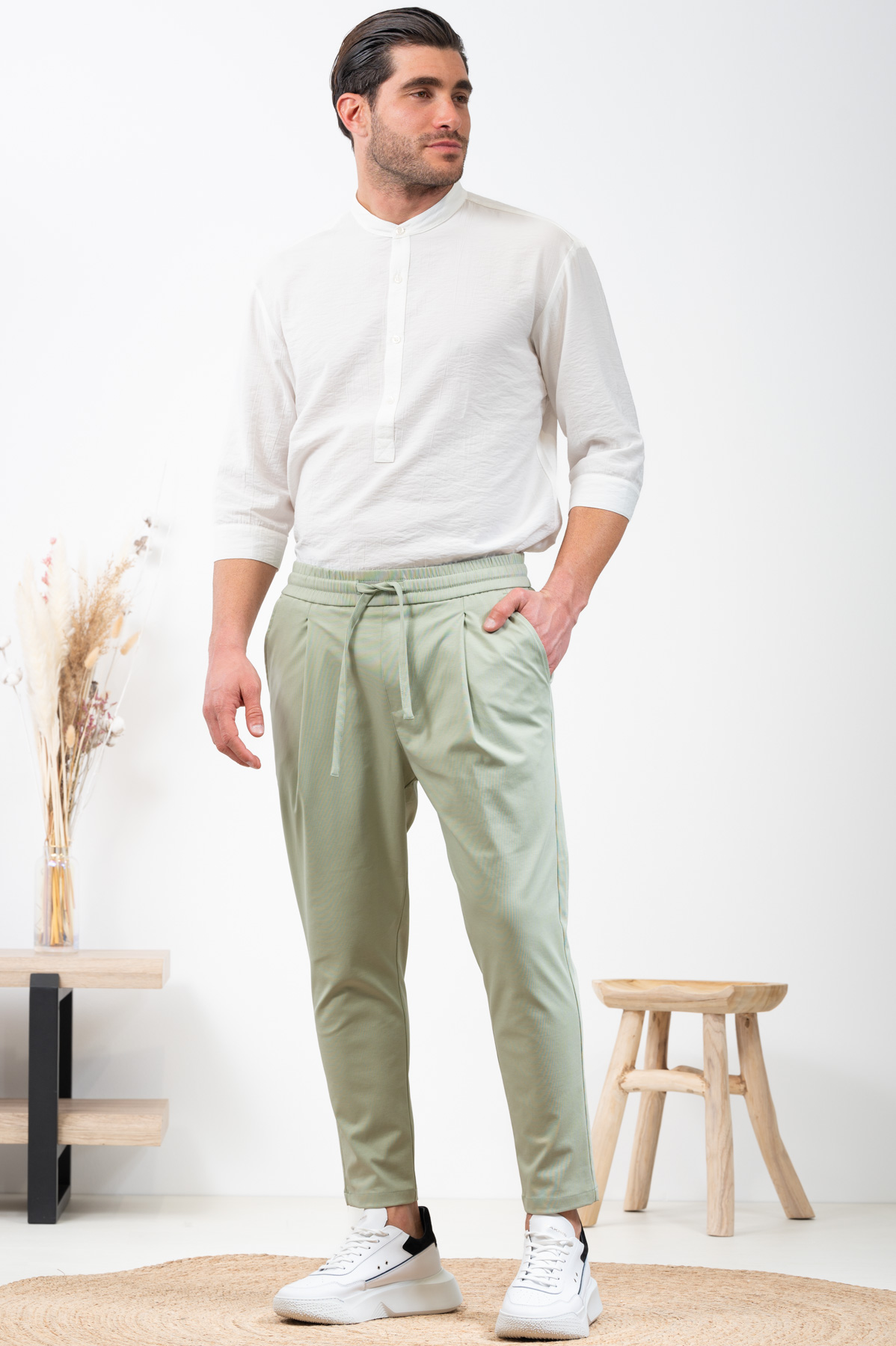 -Παντελόνι σε ύφασμα comfort με λάστιχο στη μέση και κουφόπιετα.