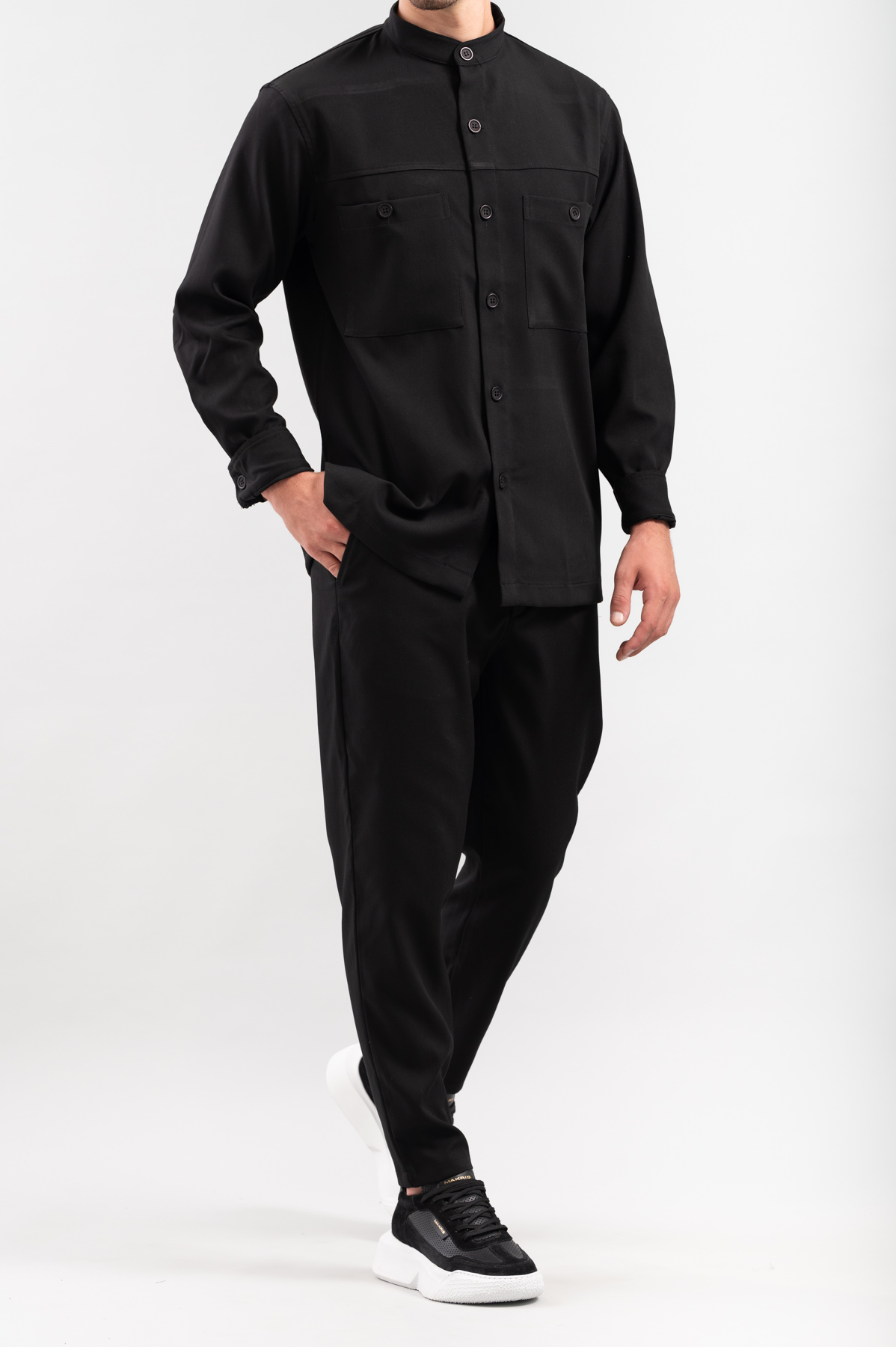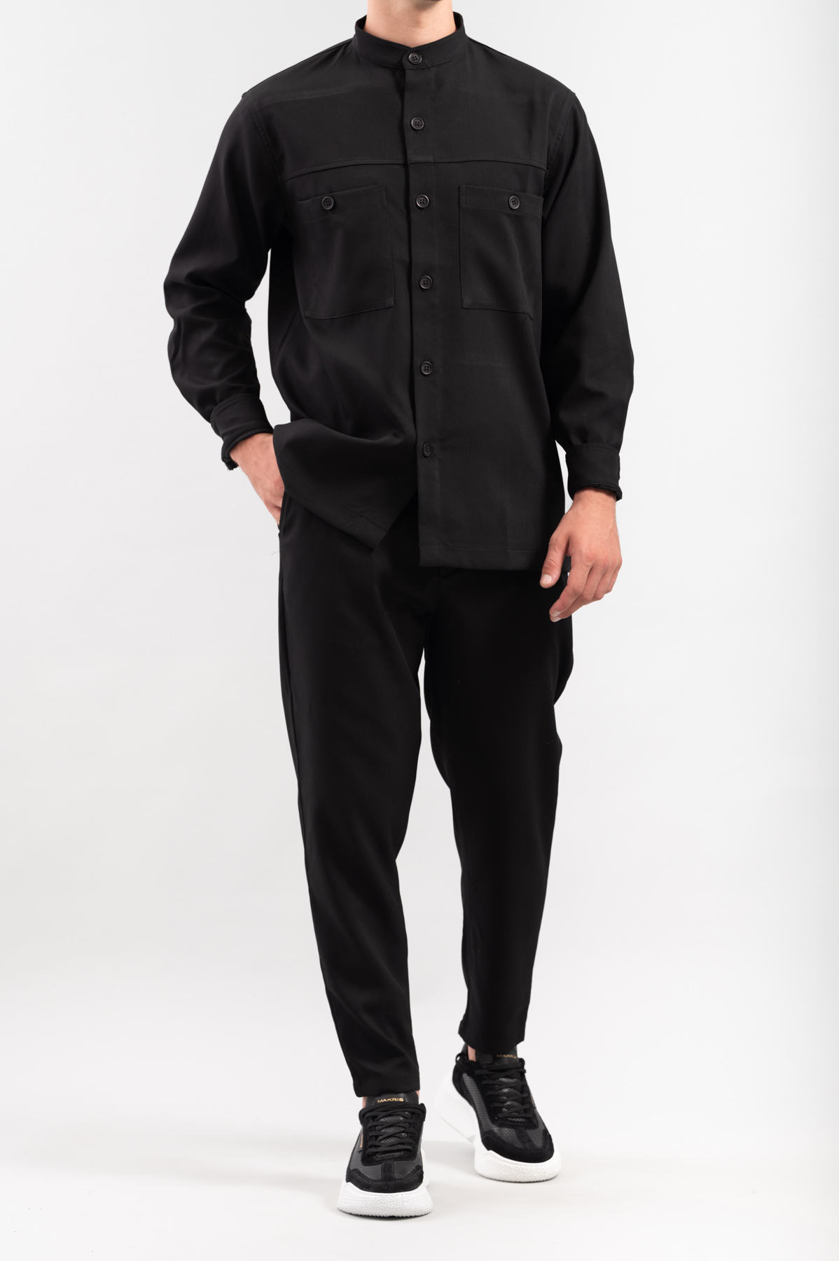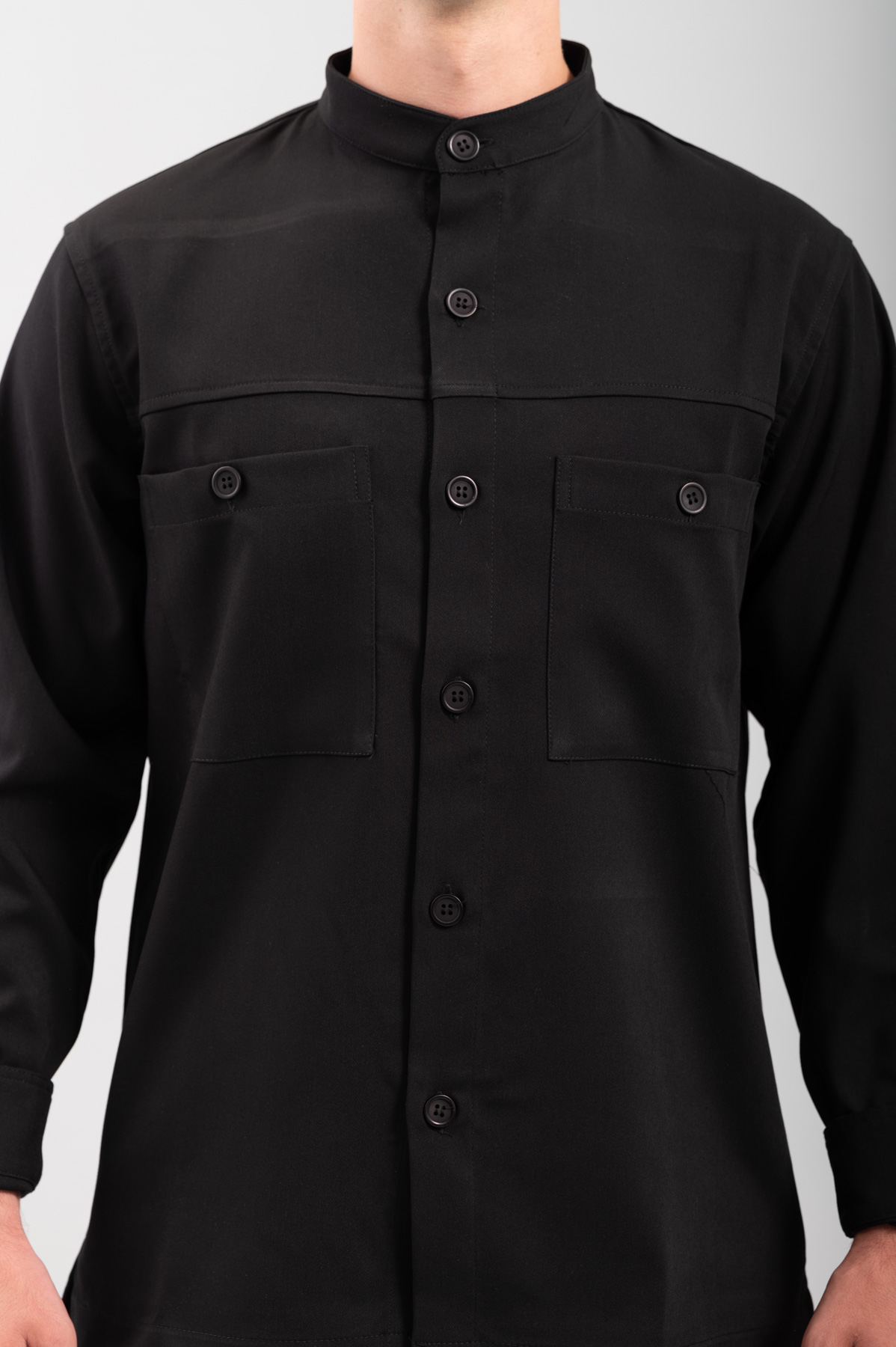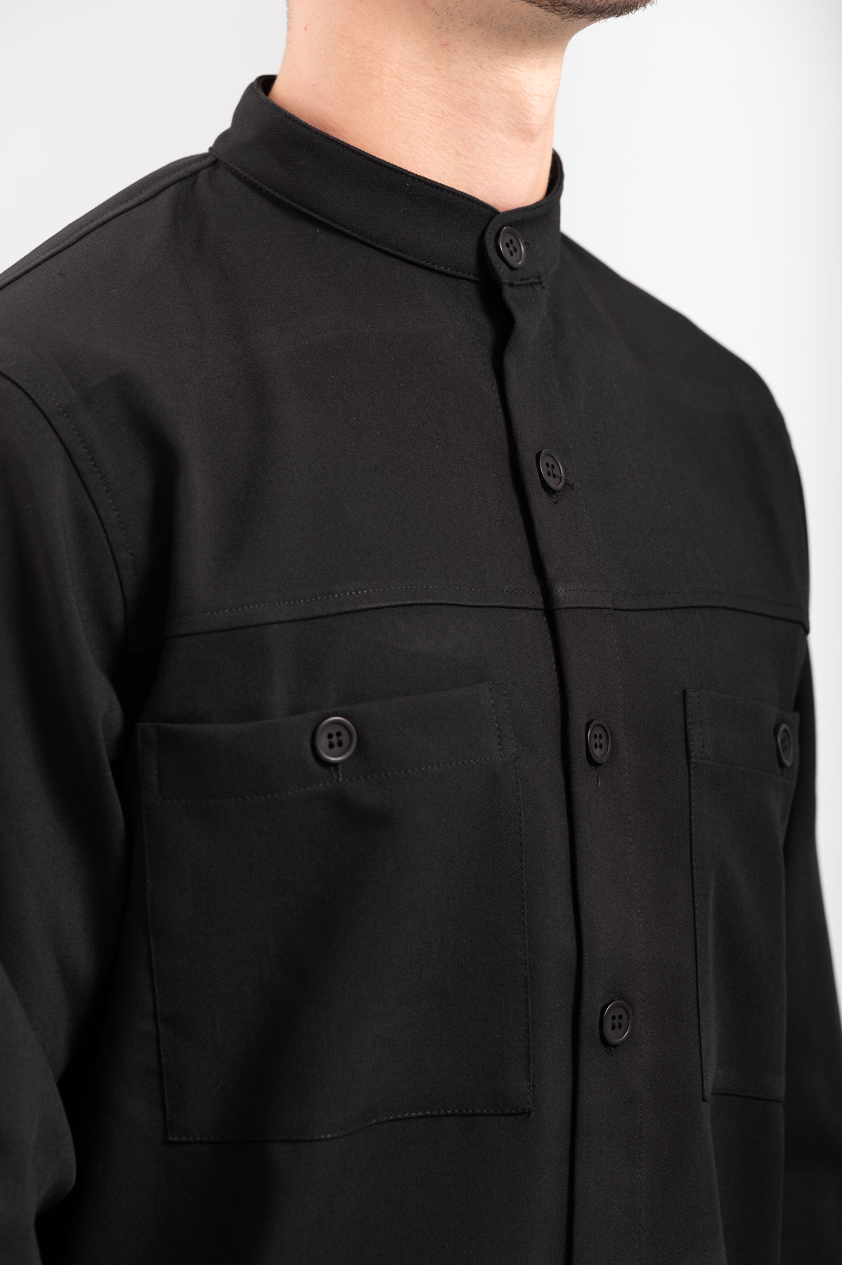 -Πουκάμισο Overshirt, με εξωτερικές τσέπες τύπου safari, μάο γιακά και κλείσιμο με κουμπιά.