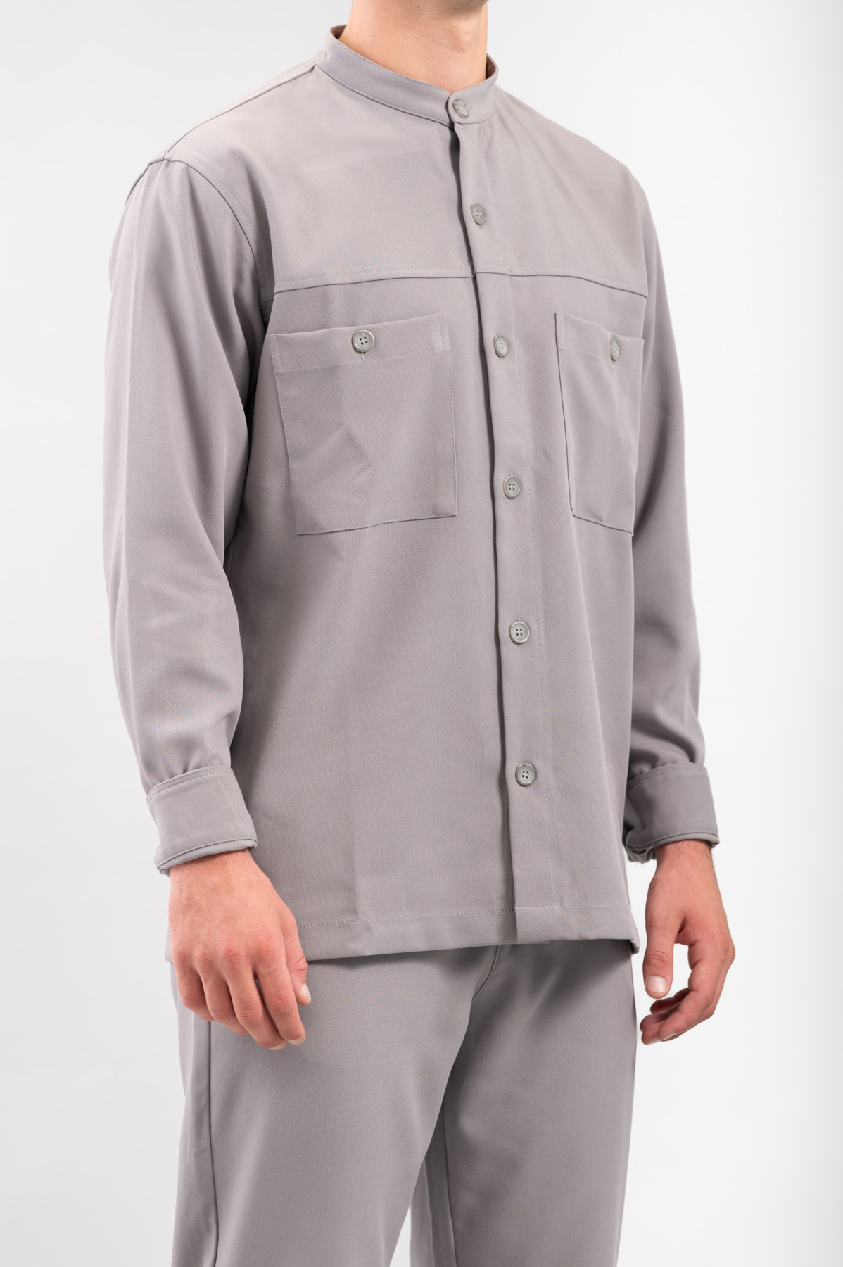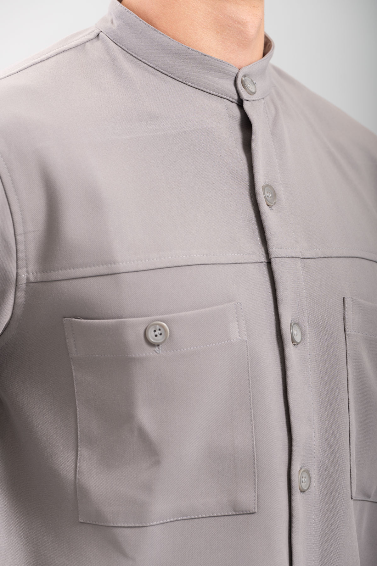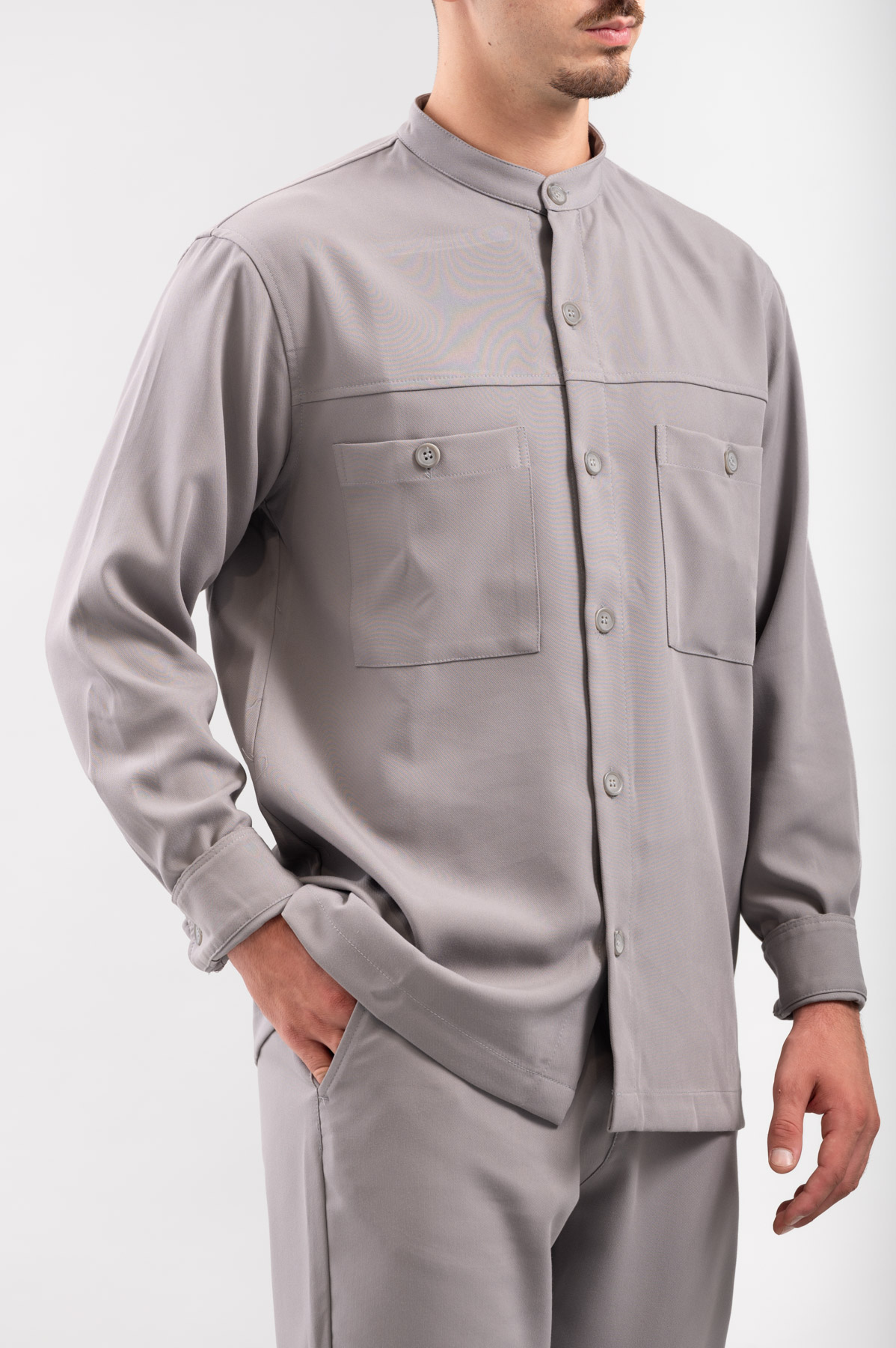 -Πουκάμισο Overshirt, με εξωτερικές τσέπες τύπου safari, μάο γιακά και κλείσιμο με κουμπιά.